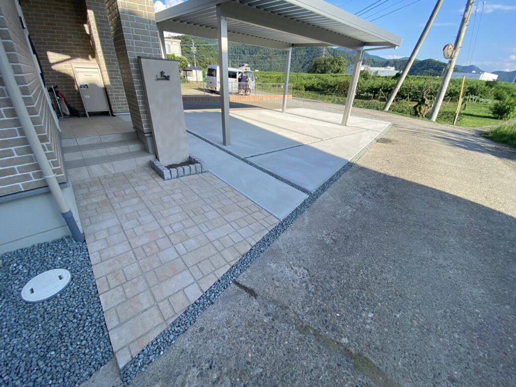土地の形状に合わせ、カーポートと駐車スペースを設置しました。同時に玄関アプローチも施工させていただきました。